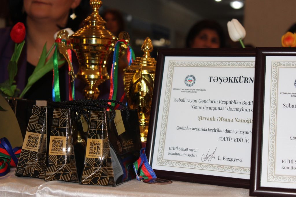 Elm və Təhsil İşçilərin Həmkarlar İttifaqının Səbail Rayon Komitəsinin ittifaq üzvləri arasında keçirilən dama yarışının qalibləri Gənclərin Respublika Bədii Yaradıcılıq Evi PHŞ-nin təşkilatçılığı ilə keçirilən tədbirdə mükafatlandırılıb. Bu haqda GreenPen.az-a ETİHİ Səbail Rayon komitəsində məlumat verilib. Mükafatlandırma mərasimi Beynəlxalq Qadınlar Gününə həsr olunmuş “Zərifliyin gücü” adlı bədii kompozisiya ilə davam edib. ETİHİ-nin nümayəndələri qalibləri və komitənin qadın ittifaq üzvlərini təbrik edərək onlara işlərində uğurlar arzulayıb.